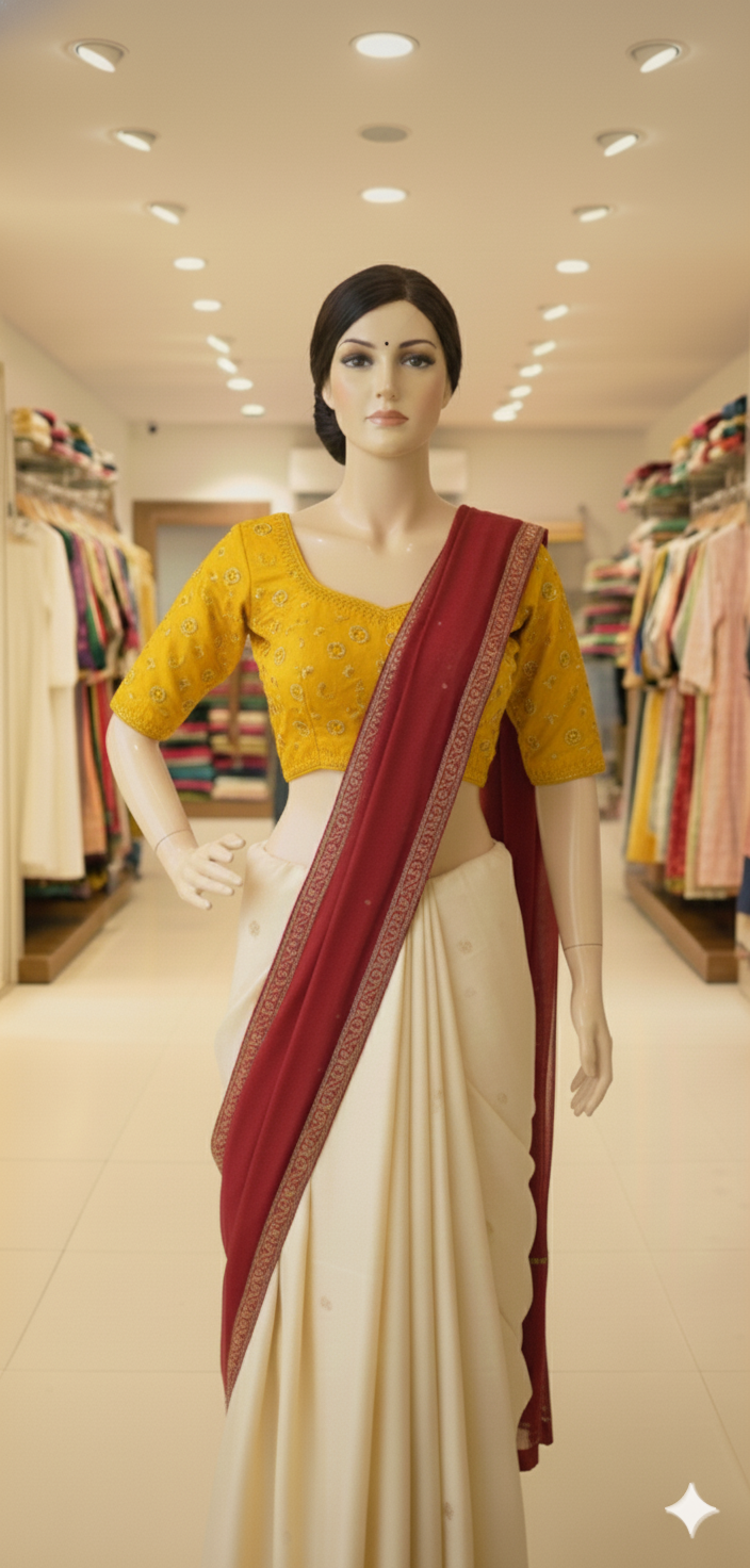 The embroidery is often highlighted with beads, sequins, pearls, mirrors or zari threads that add shine and depth to the blouse. Aari work looks beautiful on silk, cotton, satin and tissue fabrics, so it can be styled for both traditional and contemporary outfits. This technique allows artisans to make delicate floral, paisley, peacock and geometric motifs that look luxurious yet refined on blouses
