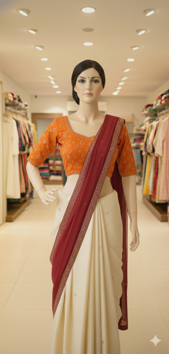 The embroidery is often highlighted with beads, sequins, pearls, mirrors or zari threads that add shine and depth to the blouse. Aari work looks beautiful on silk, cotton, satin and tissue fabrics, so it can be styled for both traditional and contemporary outfits. This technique allows artisans to make delicate floral, paisley, peacock and geometric motifs that look luxurious yet refined on blouses